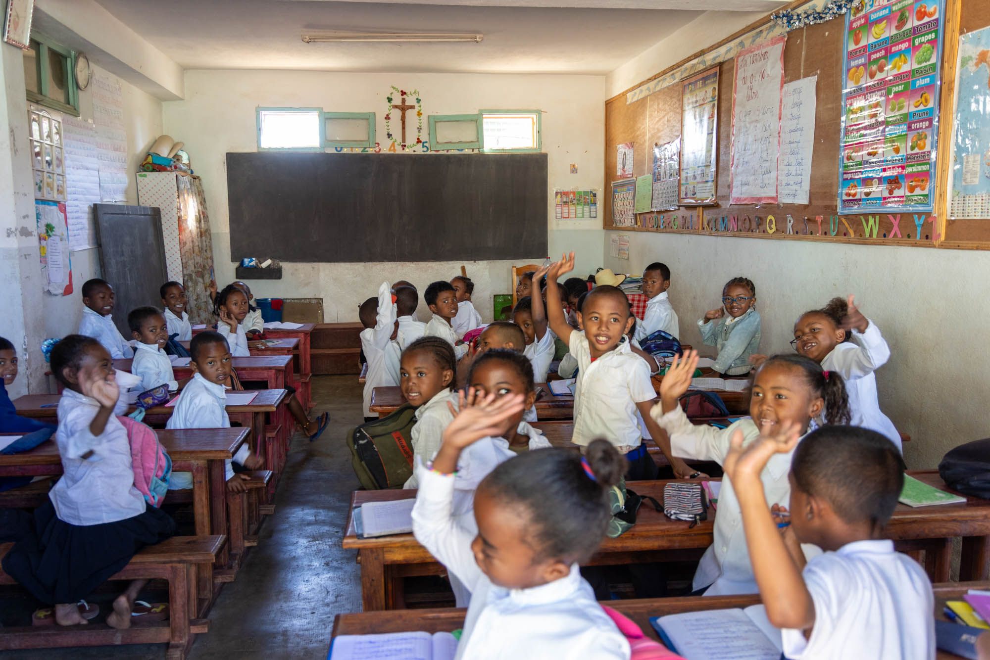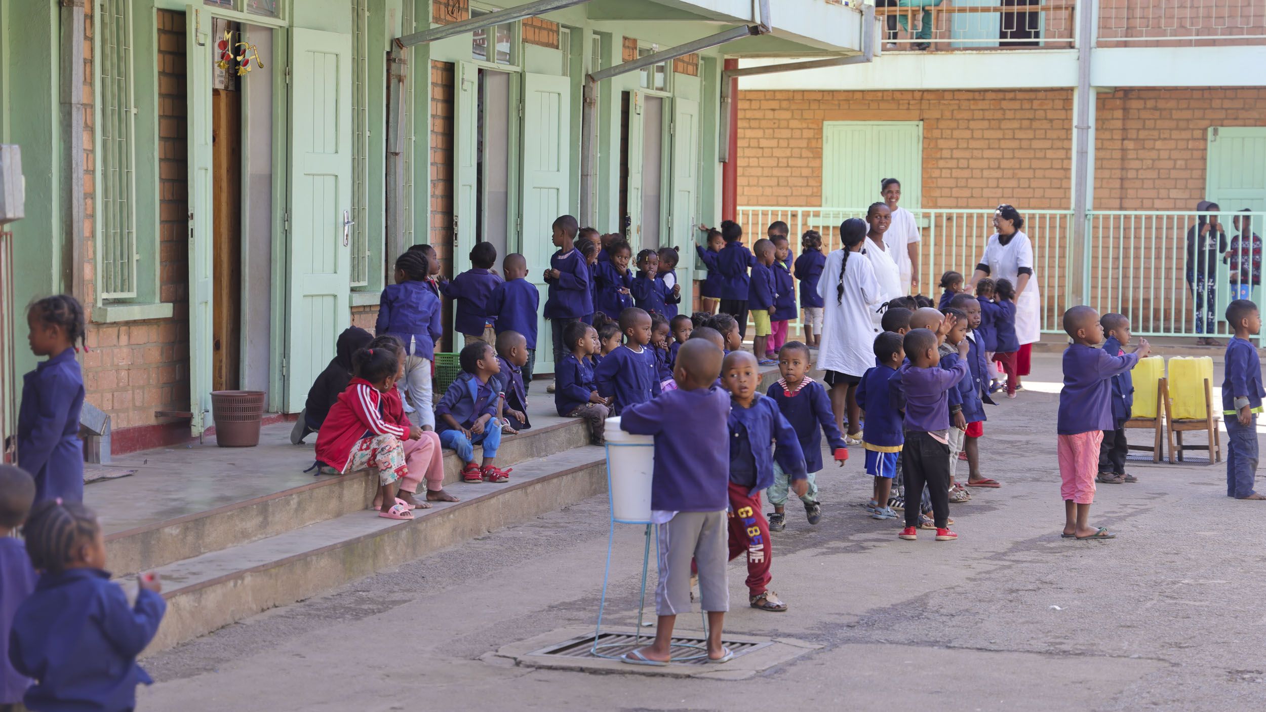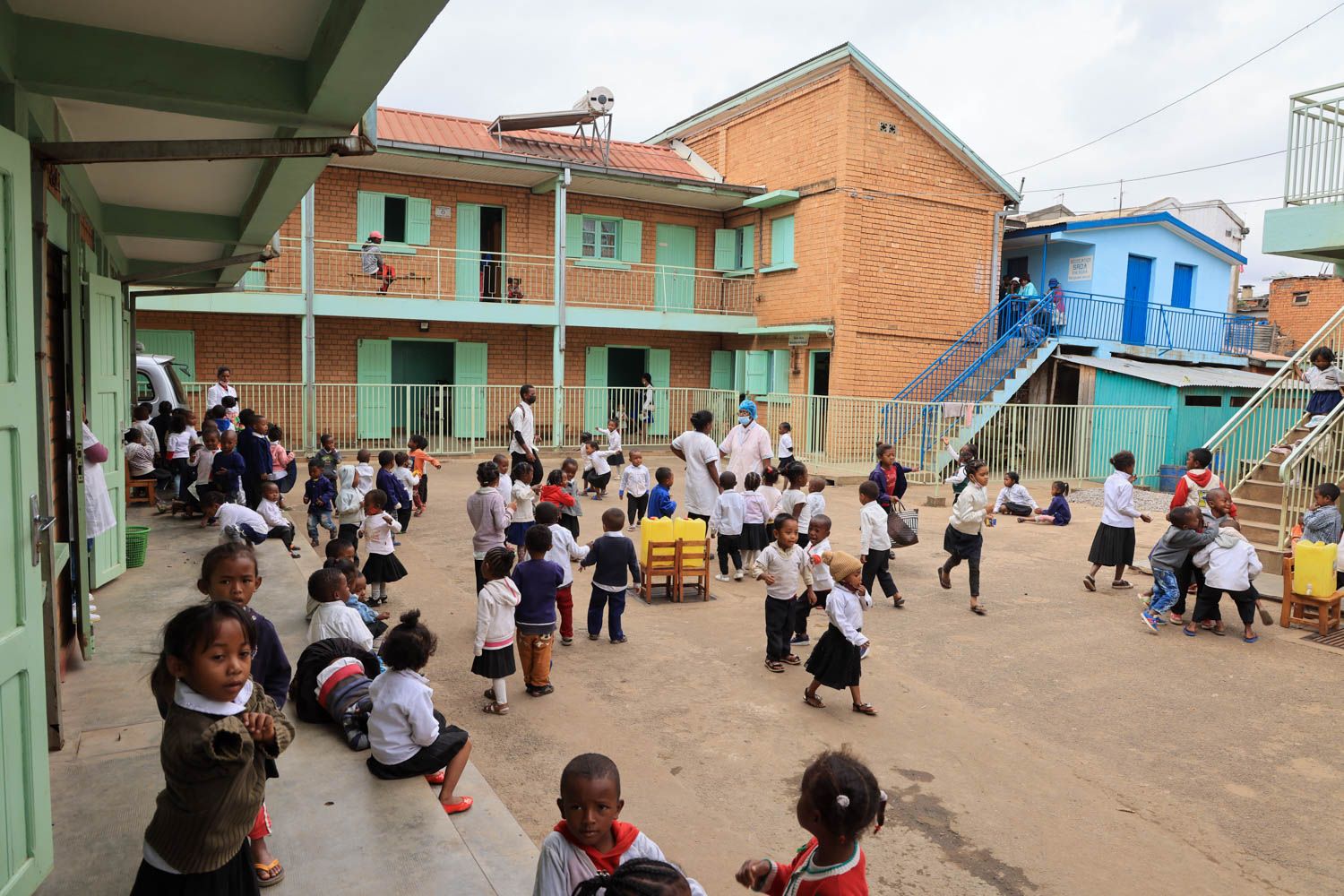 L’école est ouverte du lundi au vendredi, et le Centre assure la scolarité de 900 enfants. Sur place, les cours vont du préscolaire au CM2, où les enfants sont pris en charge par 22 enseignants dans des salles de classe bien équipées. Depuis 2011, le Centre a ouvert des classes d’alphabétisation qui accueillent les enfants des rues, de tout âge. Les cours sont dispensés en français et en malgache. Le Centre continue également d’accompagner les meilleurs de ses élèves, au Collège privé ou publique, au Lycée, et même en études supérieures depuis l’année scolaire 2022-2023. Il continue à soutenir aussi celles et ceux qui partent en formation professionnelle (mécanique, couture, coiffure, électricité, etc…). A la rentrée 2025, l’école commence à ouvrir progressivement les 4 niveaux du Collège (6ème en 2025, 6ème + 5ème en 2026, et ainsi de suite). Le Centre est officiellement reconnu par l’Etat en tant qu’école, depuis 2007 et les enfants y passent leur diplôme à la fin du primaire (CEPE), ce qui permet à certains de pouvoir continuer leurs études dans le secondaire. Cette reconnaissance permet également de bénéficier de la part de l’Etat des manuels scolaires gratuits.