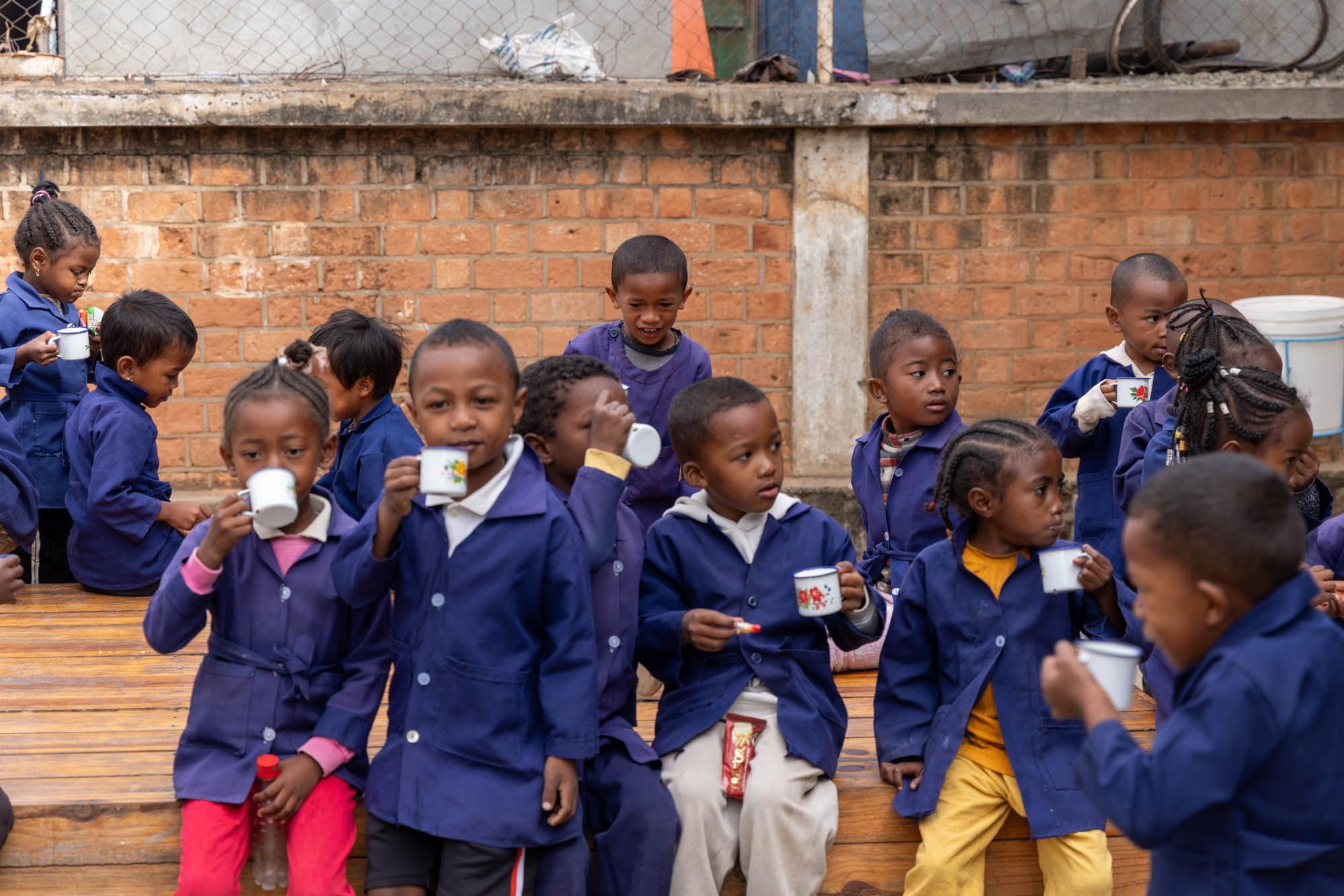 Le dispensaire s’inscrit dans un projet global du gouvernement malgache visant à lutter contre la malnutrition. Ainsi 80 bébés du quartier sont encadrés par un programme alimentaire dès l’âge de 6 mois jusqu’à 5 ans. Ils sont allaités à la naissance par leur mère, si ce n’est pas possible le lait maternel est remplacé par du lait concentré car le lait maternisé est inabordable et difficile à trouver. Puis ils reçoivent régulièrement des compléments alimentaires sous forme d’une préparation de poudre de maïs, d’huile, de sucre et de vitamines.