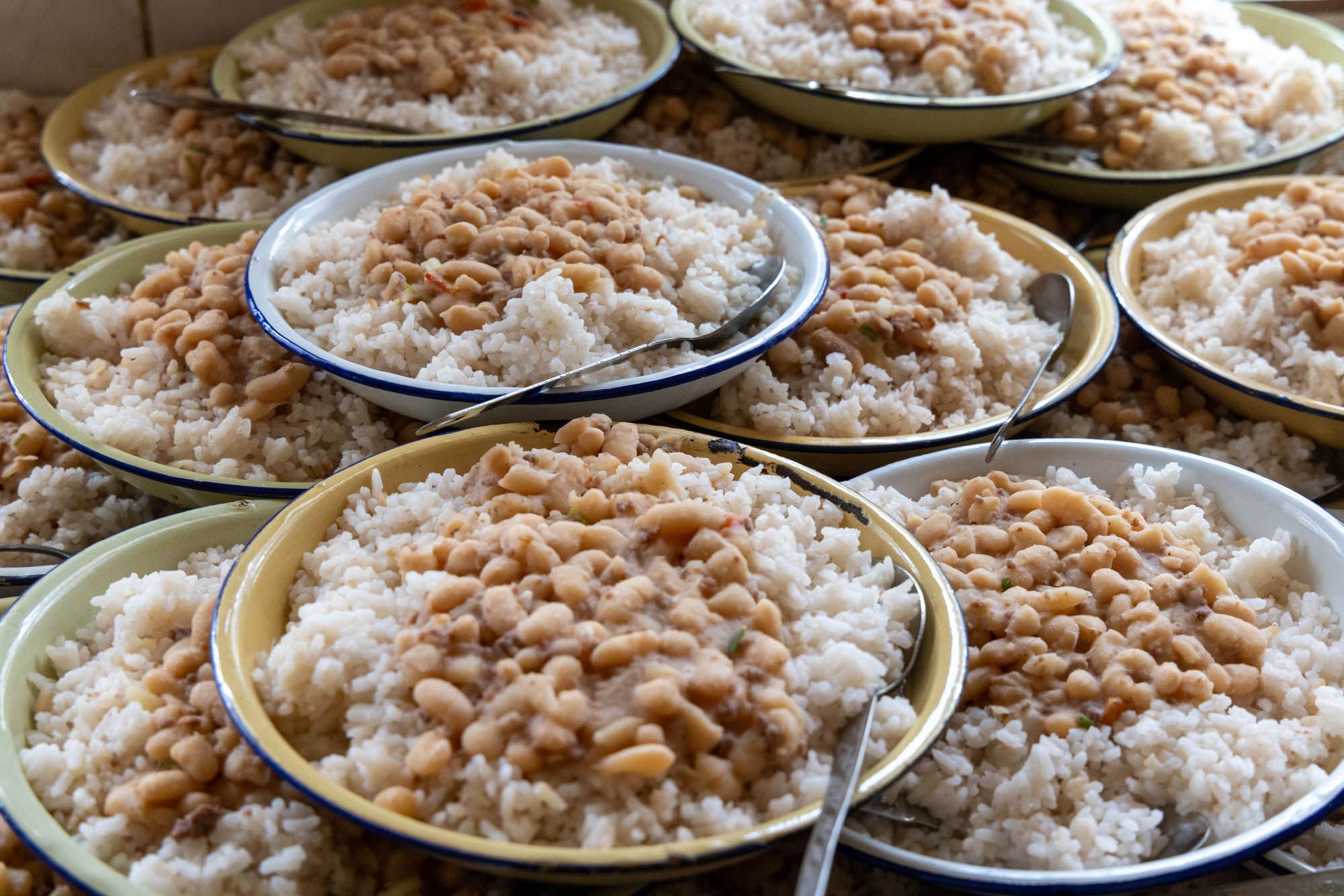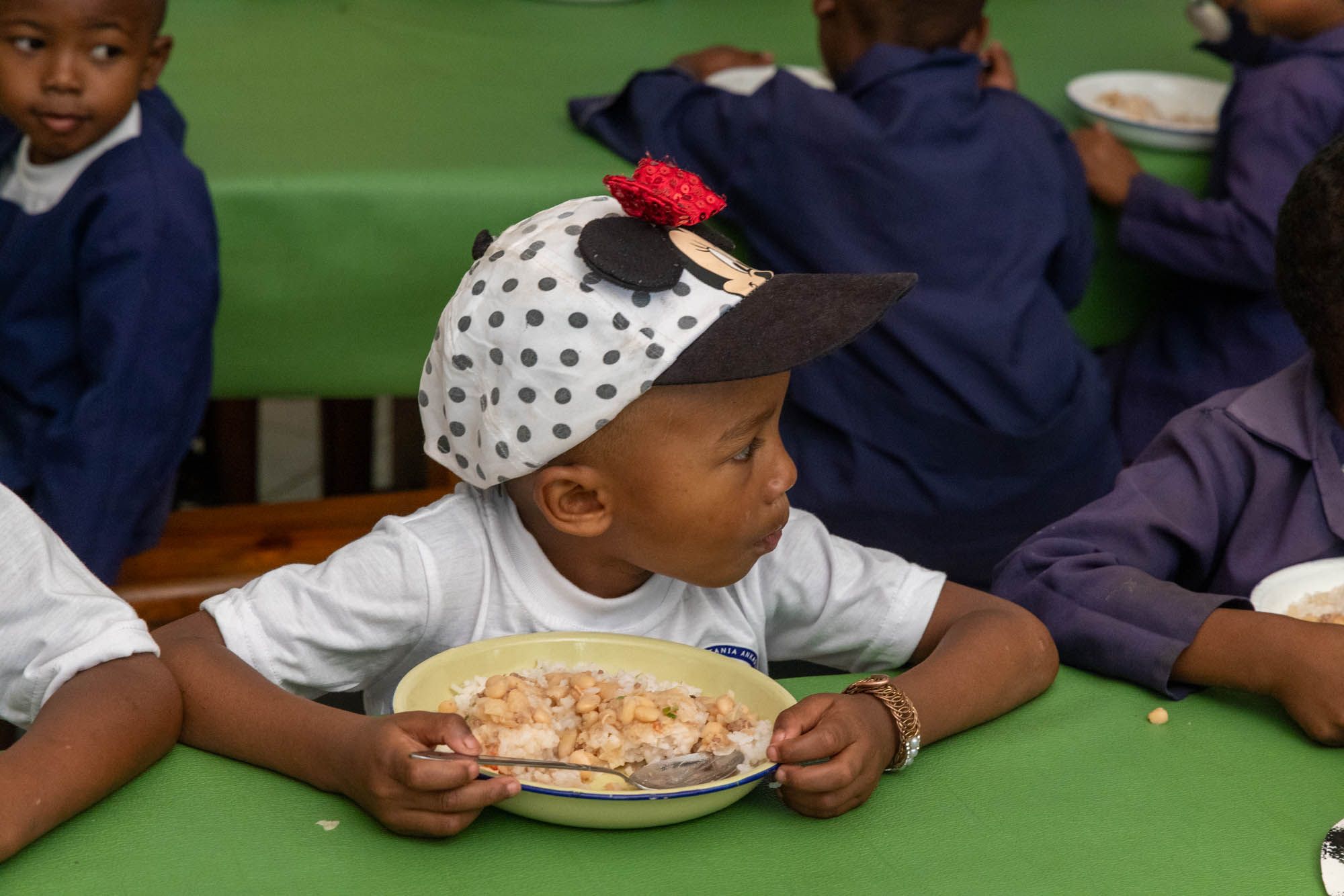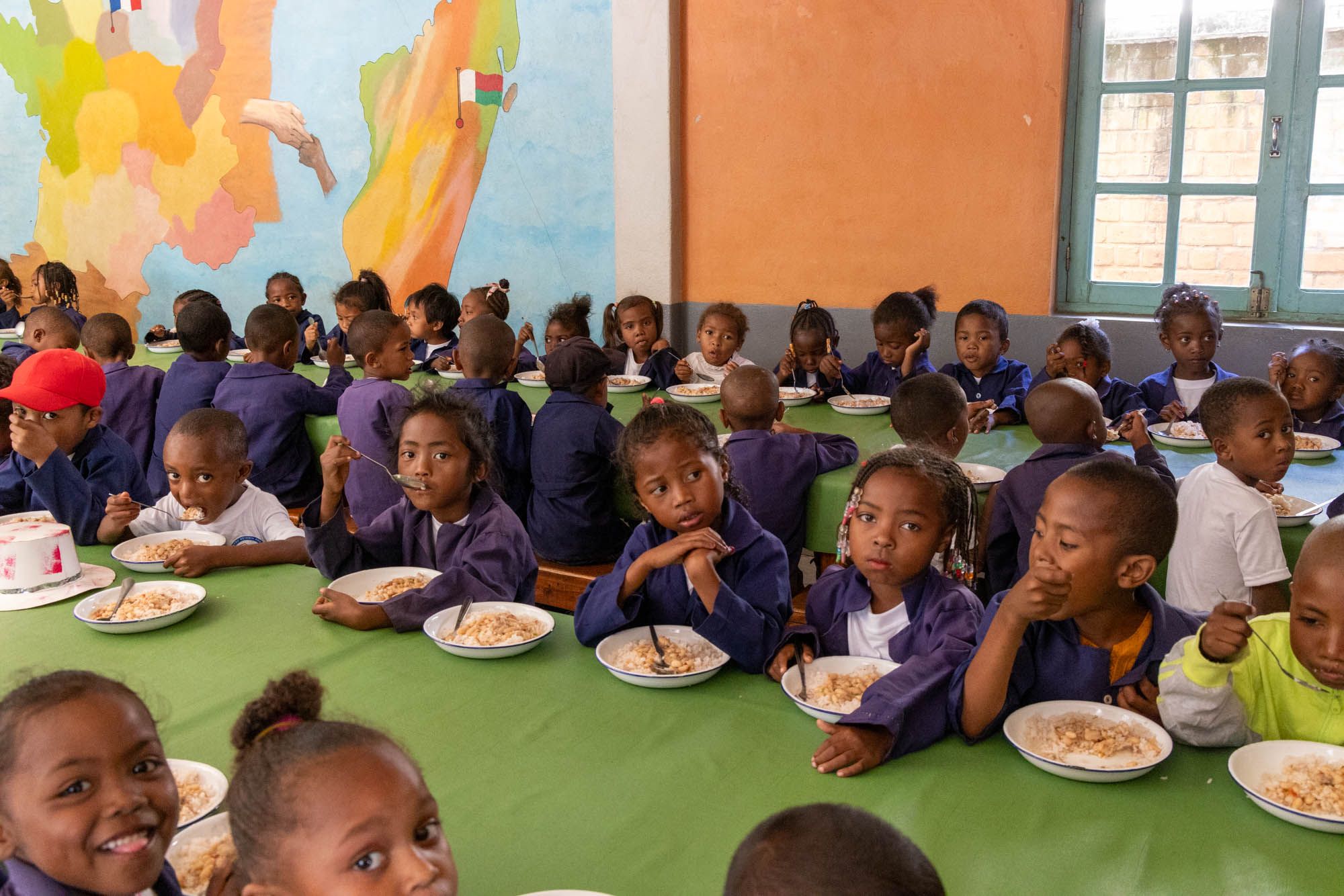 Il convient d’assurer un repas quotidien aux 900 enfants du Centre, y compris aux jeunes collégiens, lycéens ou étudiants qui viennent déjeuner le midi au Centre. Ce repas est constitué essentiellement de riz blanc (nourriture de base des malgaches) et de légumes. Les Enfants d’Ankasina met en place en 2024 l’Opération « Tarita », destinée à améliorer la qualité nutritionnelle des repas par l’apport hebdomadaire en protéines (viande, œuf, légumineuses), en calcium (lait, yahourt), et en vitamines (fruits frais). Chaque jour, c’est 100 kilos de riz qui sont consommés. L’Opération « Tarita » entraîne la baisse de cette consommation exclusive, grâce à l’apport d’autres denrées alimentaires et au profit de la diversification des sources de glucides (remplacement du riz blanc par du riz demi-complet, pâtes au blé…). Le personnel alloué à cette tâche comprend une petite dizaine de personnes (cuisine, plonge, etc.).